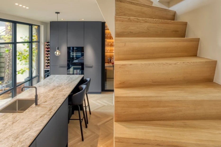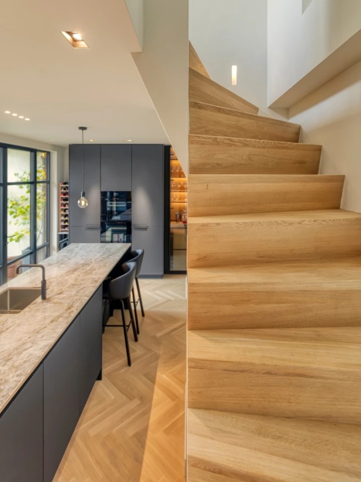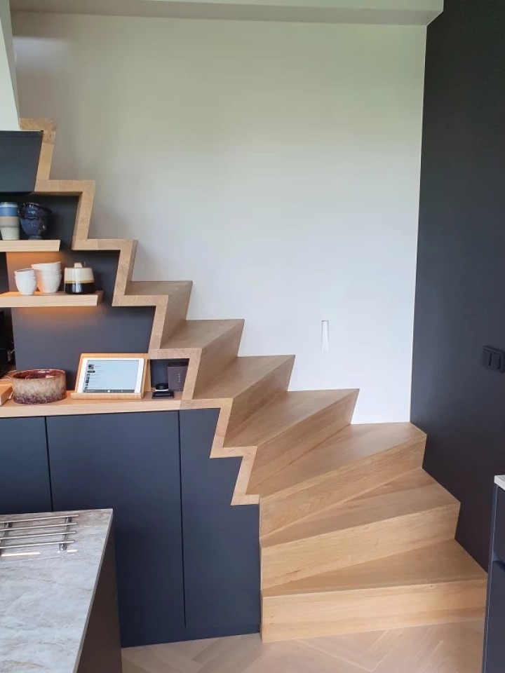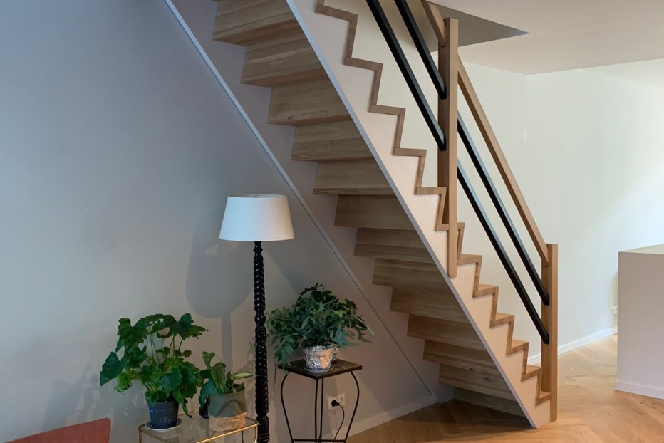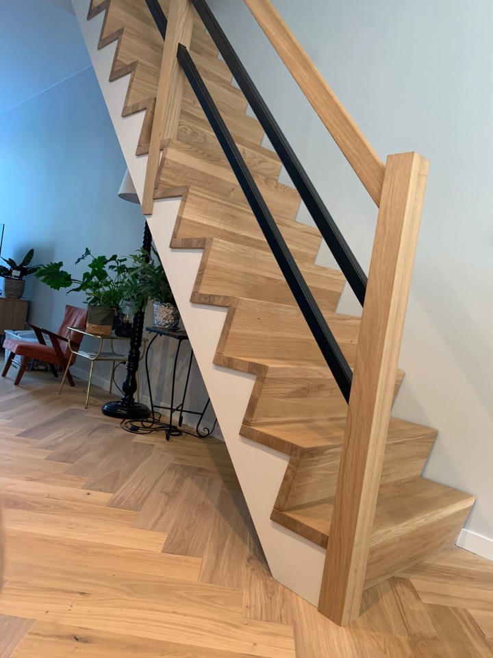 Een Z-trap kenmerkt zich door een strak en modern design, waarbij de treden en stootborden samen een hoek in de vorm van een 'Z' creëren. Hierdoor ontstaat een strak en zwevend effect, zonder zichtbare trapbomen. In combinatie met massief eikenhout ontstaat een robuuste, warme uitstraling die perfect past bij zowel minimalistische als landelijke interieurs.